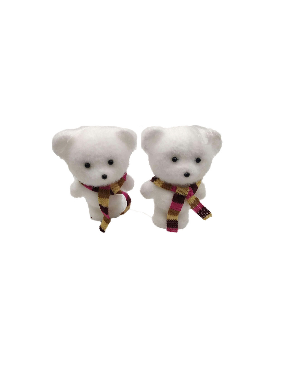 Contiene dos ositos de plástico en color blanco recubiertos de pelito brillante para simular el pelaje del animal. Tiene unas cintas en la parte superior por si se quieren colgar. Tienen unas medidas de 8x5x11cm aprox.