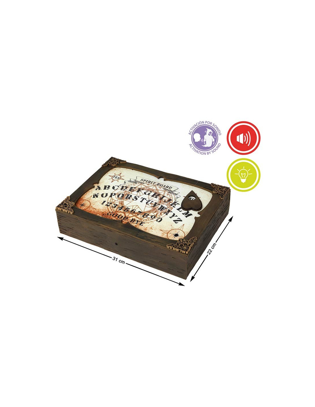 Esta Ouija para decoración Halloween tiene un tamaño de 31x22cm. Contiene luz y sonido que se activa por sonido. No incluye pilas.