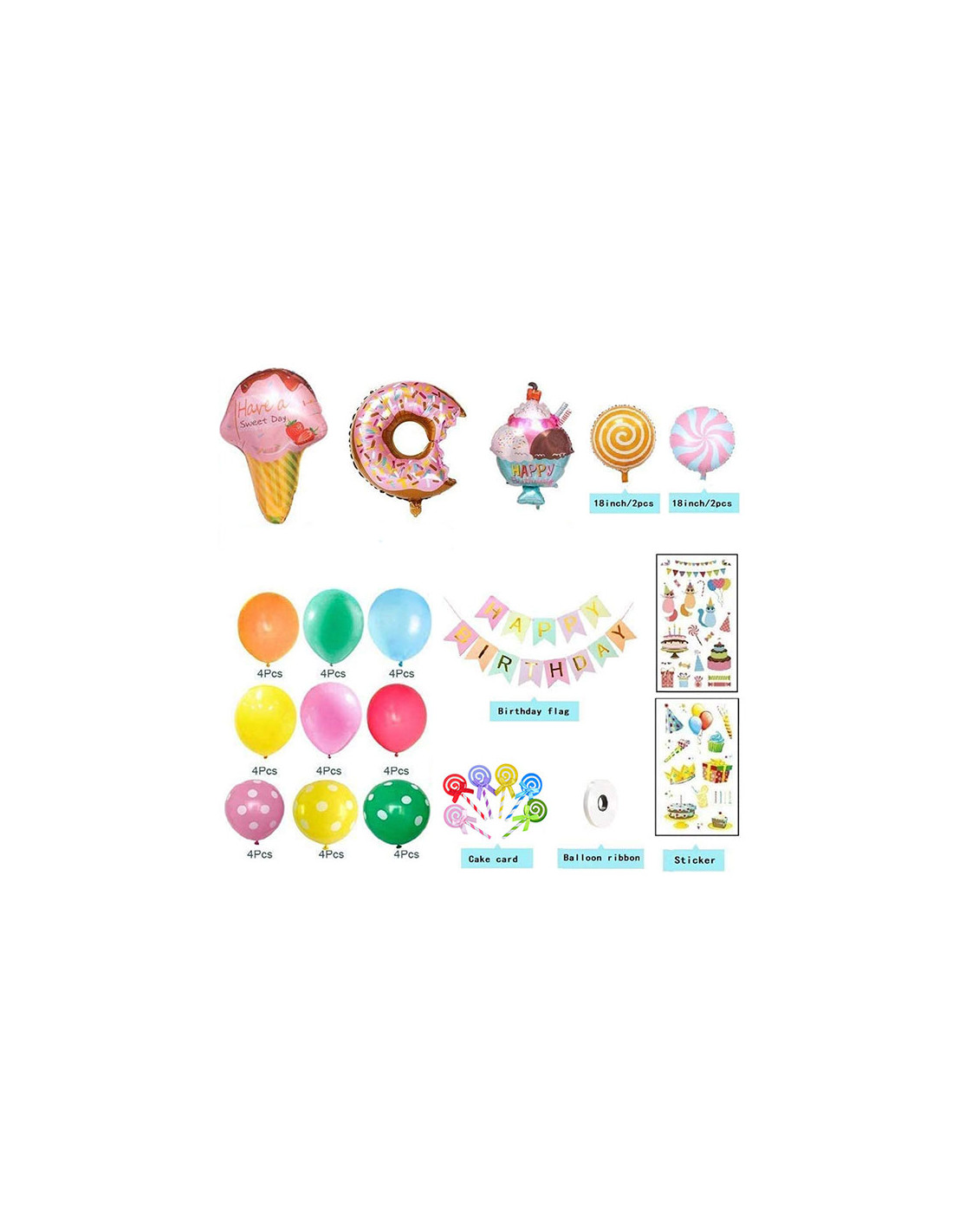 El pack contiene una guirnalda con la palabra Happy Birthday (cada banderín mide 16x20cm), dos globos metalizados diferentes con forma de helados, decoración para tarta o aperitivos, 12 globos de topos en tres colores diferentes (verde, morado y amarillo) de 30cm de perímetro, 24 globos de látex de 30cm de perímetro en color rojo, rosa, azul, amarillo, verde y naranja; 4 globos metalizados de 45cm aprox de perímetro en forma de dulce, un mega globo metalizado de donut y  2 packs de tatuajes temporales.