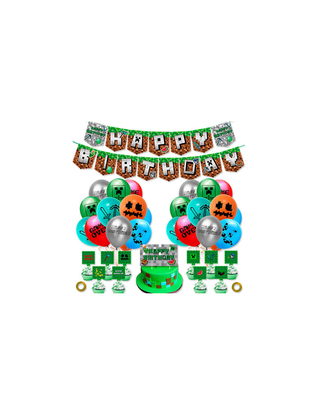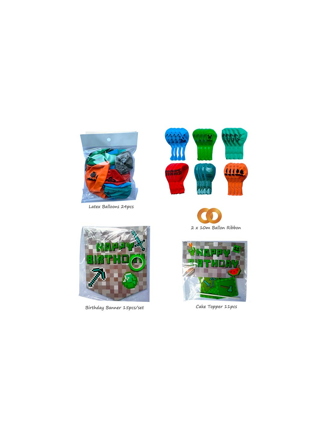 Pack decoración cumpleaños Minecraft que incluye una guirnalda con la frase 'Happy Birthday', 24 globos de 30cm de perímetro con 6 estampados distintos y 11 piezas para decorar los aperitivos o tartas.