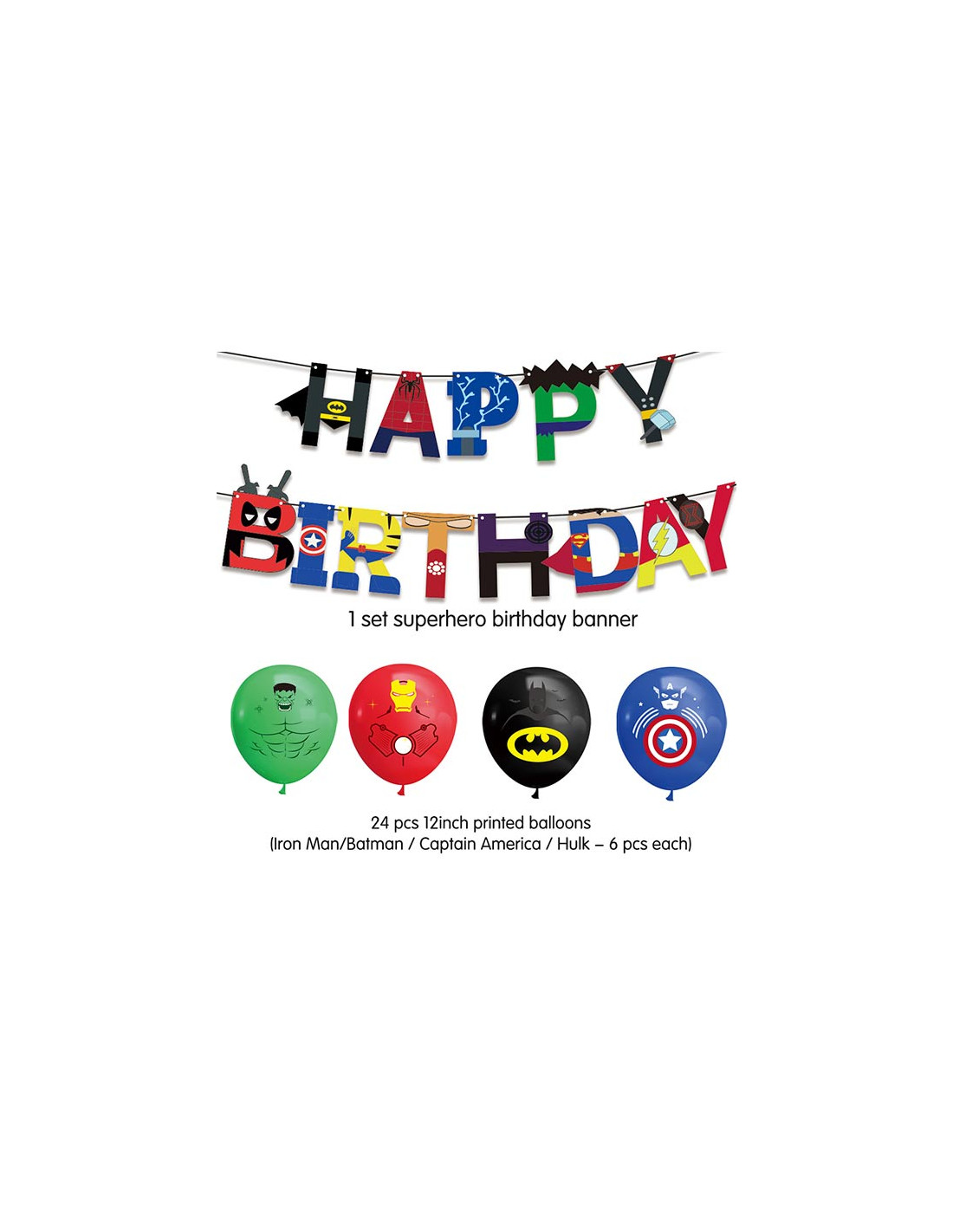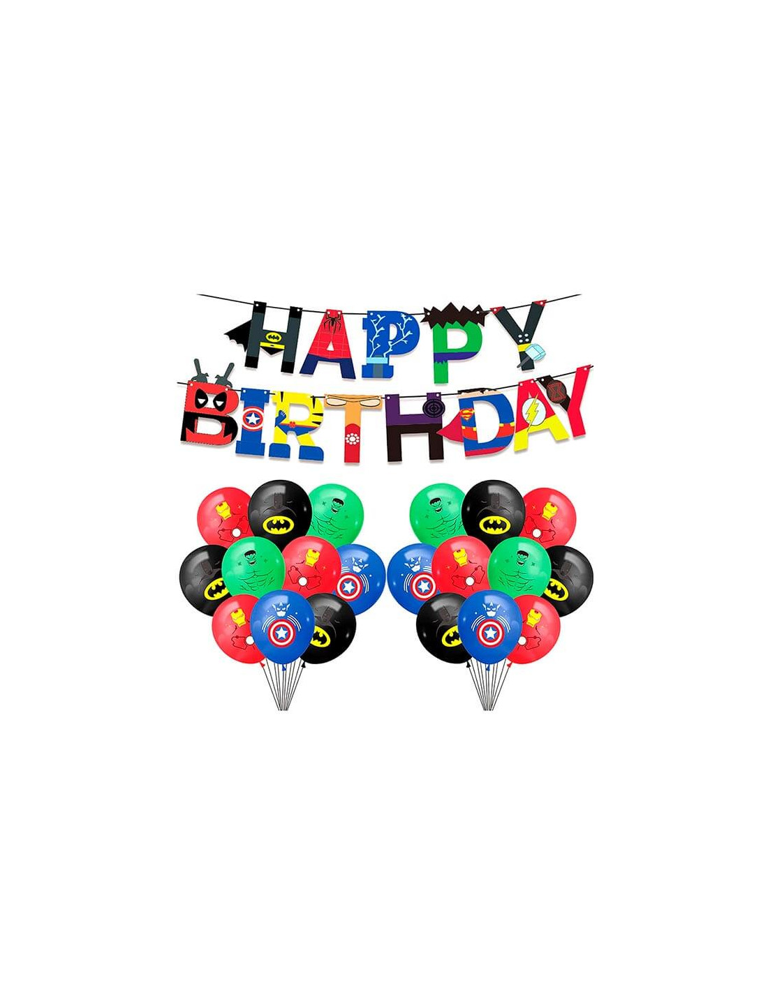 Pack decoración cumpleaños Superhéroes que incluye un letrero de decoracion Happy Birthday con diferentes estampaciones de los Super héroes y 24 globos con las imagenes de Iron Man, Batman, Capitan América y Hulk (6 globos por personaje) de 30cm aprox de perímetro.