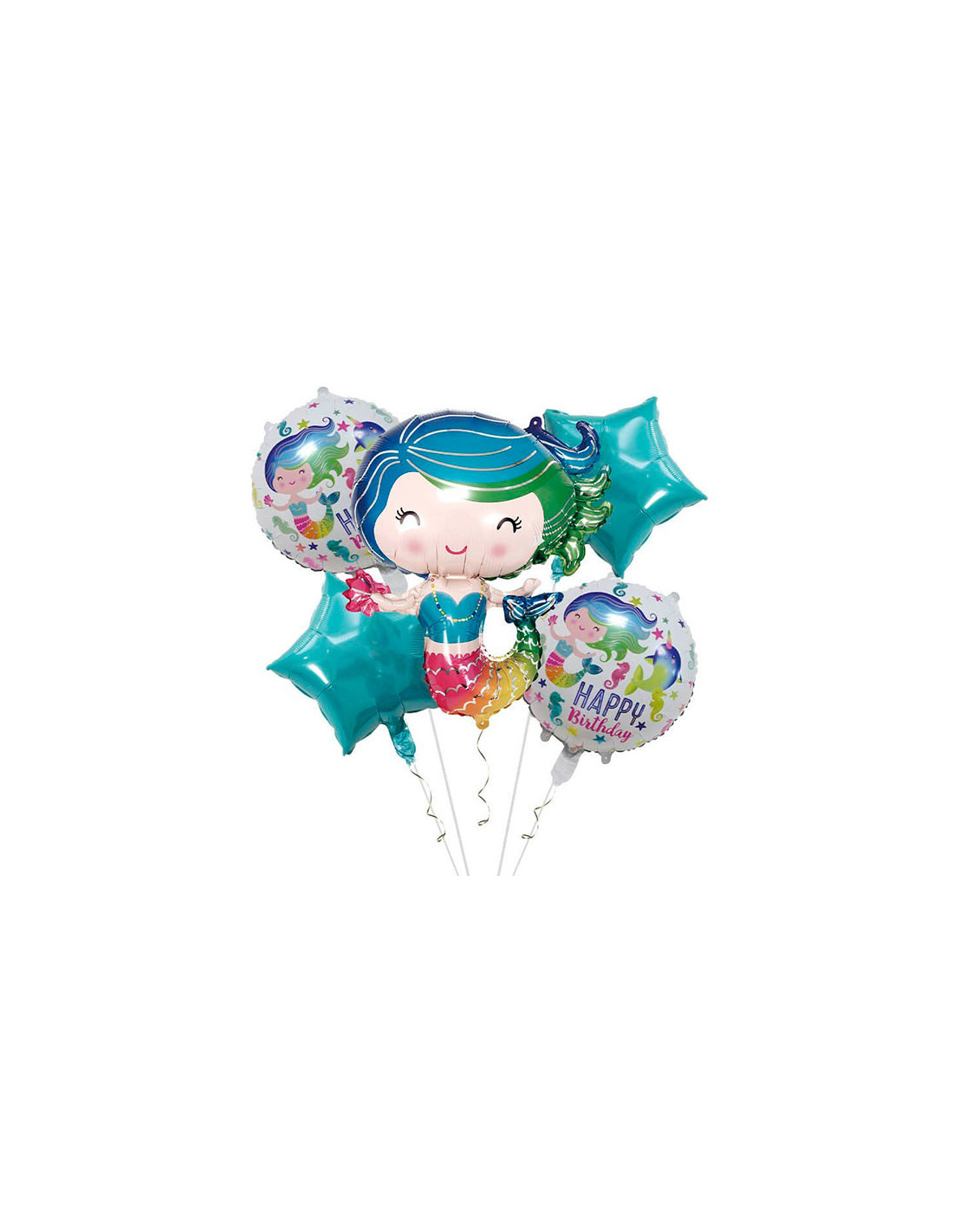 Pack de globos sirenita que incluye 4 globos de 46cm aprox y una sirenita de 91cm aproximadamente.