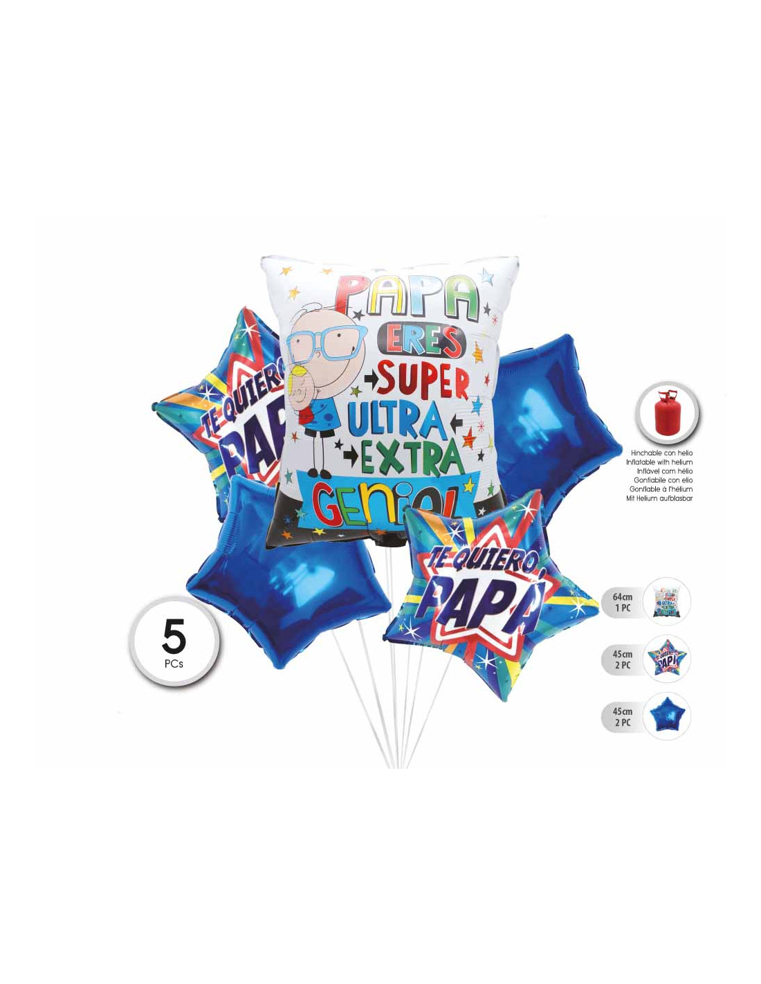 Pack globos súper padre que incluye 5 globos: 1 de 64cm, 2 de 45cm y 2 de 45cm.