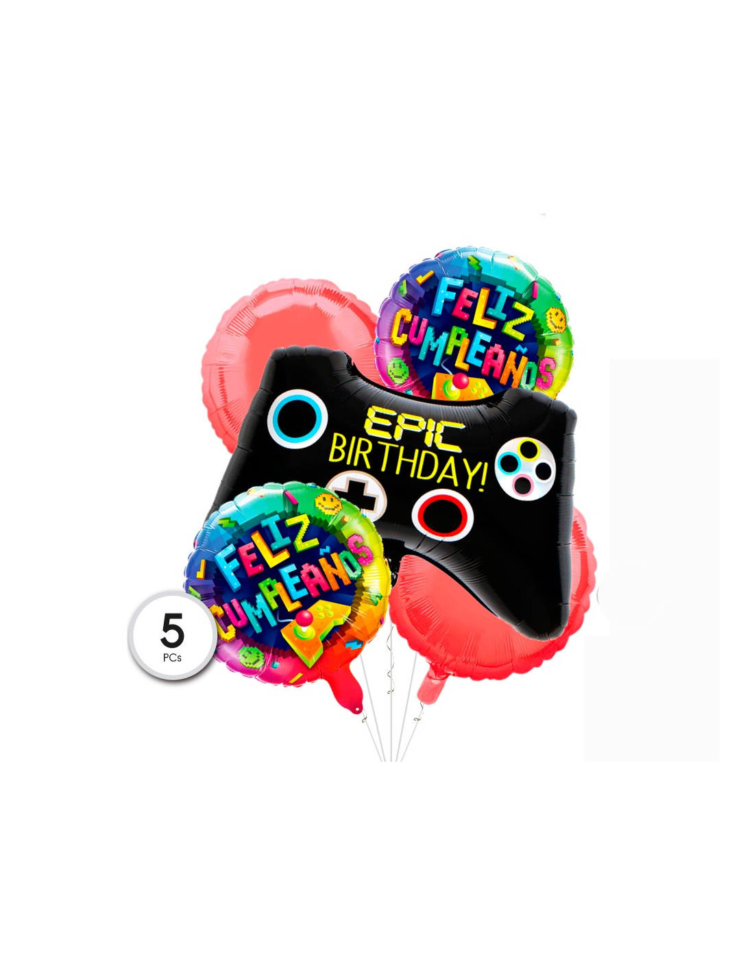 Pack globos videojuego que incluye un globo con forma de mando de consola de 69cm, dos globos "Feliz Cumpleaños" de 45cm y dos globos redondos de 45cm.