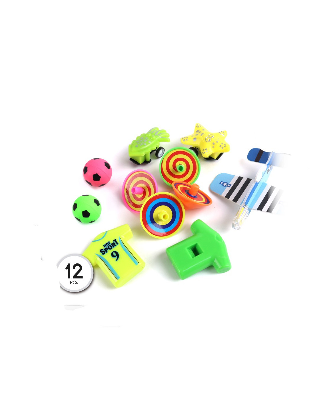 Pack juguetes piñatas deportes que incluye 12 piezas, entre las que se incluyen un avión para montar, tres pelotas, cuatro peonzas, dos silbatos con forma de camiseta y dos figuras móviles.