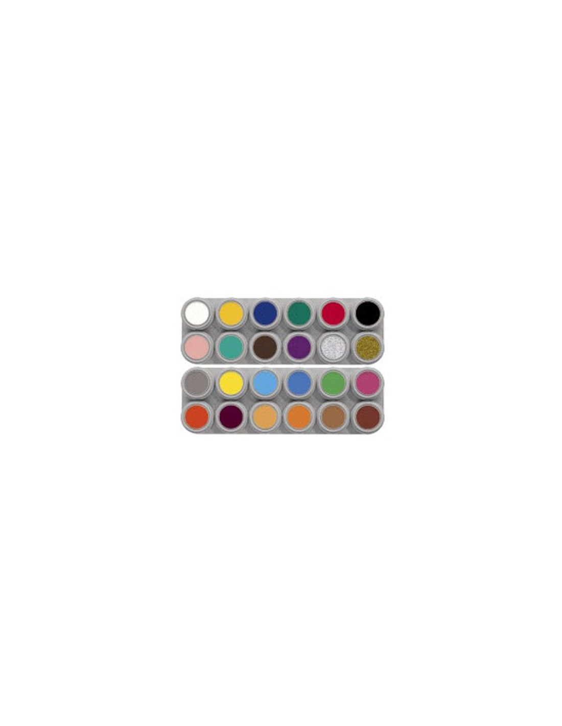 Paleta de maquillaje al agua que contiene 24 colores diferentes para jugar con ellos. Es un maquillaje con base de agua sin fragancia y sin gluten, para pintar la cara y el cuerpo, que se usan básicamente para maquillaje profesional y maquillaje teatral. Funciona como una acuarela y se pueden mezclar los colores entre sí.