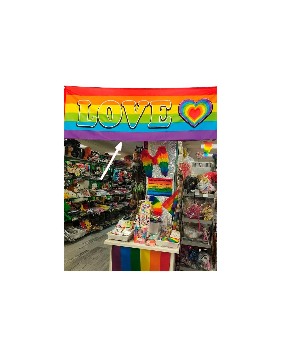Pancarta Love Arco Iris multicolor de poliéster y con el mensaje 'LOVE'. Tiene unas medidas de 74x220cm y dispone de 4 ojetes para su fácil colocarión.