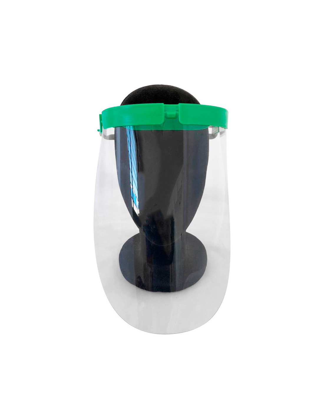 Pantalla de Protección facial que consta de una pantalla de plástico transparente y un soporte para la cabeza.