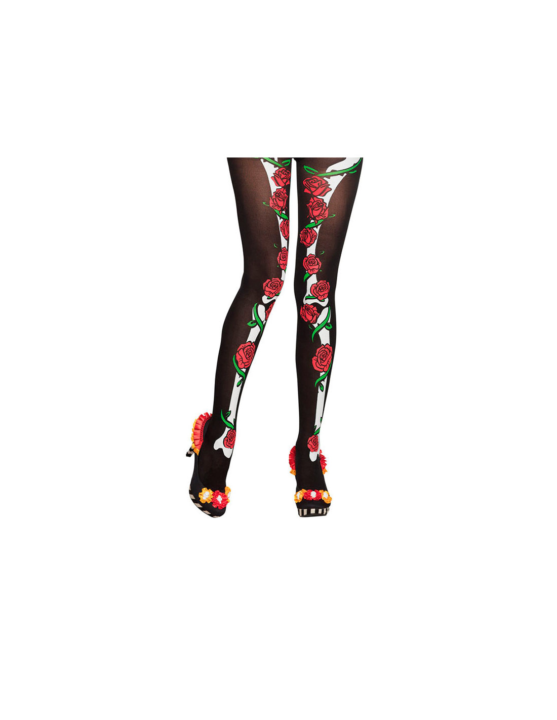 Estos pantys son negros con estampado de huesos y rosas. Tiene 40 deniers y es talla única.