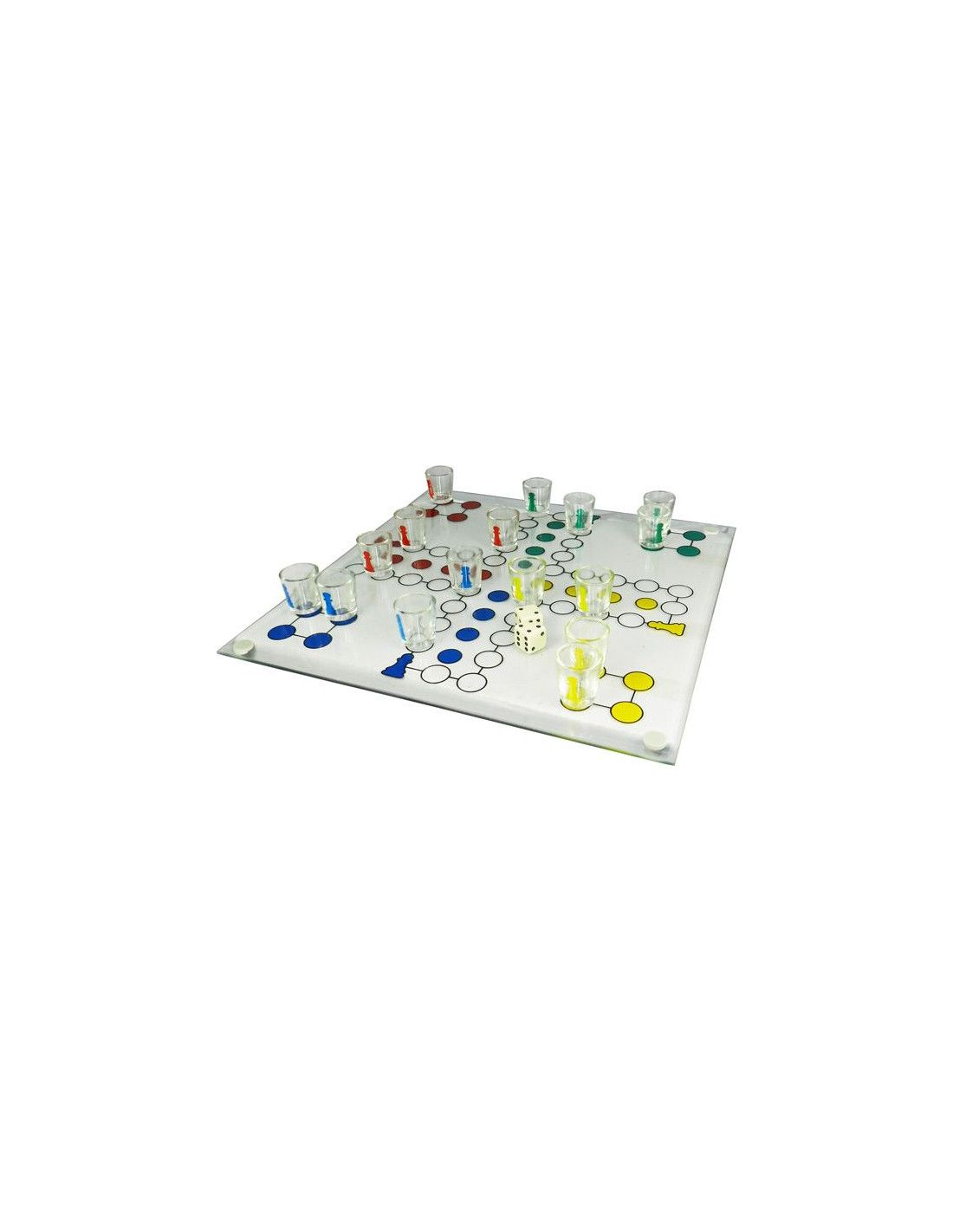 Parchís con chupitos que incluye un tablero de cristal, 2 dados y 16 vasos de chupitos de cristal.