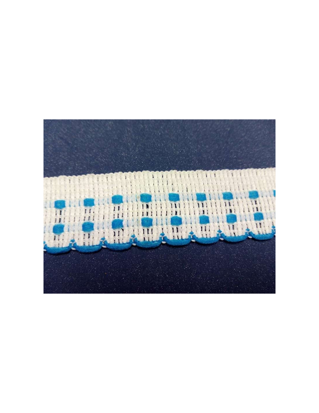 Pasamanería de algodón con adornos azules. No elástica. Anchura 24mm. Se vende por metros. Unidad mínima de compra 1m.