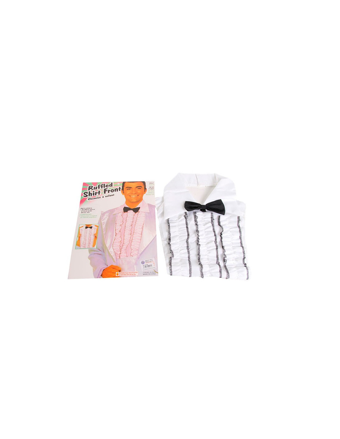 Pechero de camisa con volantes verticales, cuello y pajarita negra.