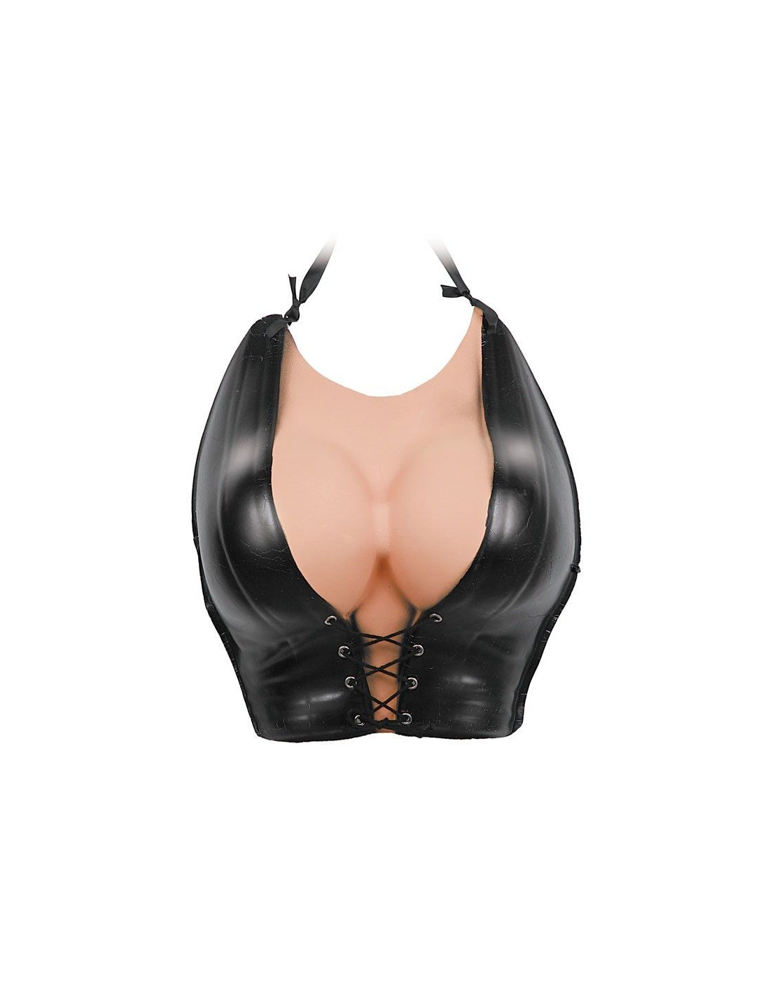 Convierte al novio en toda una dominatrix sin piedad con estas tetas con corset. Incluye unas originales tetas con corset de color negro al más puro estilo sado fabricado en plástico, y un cordón de tela para sujetas al cuello.