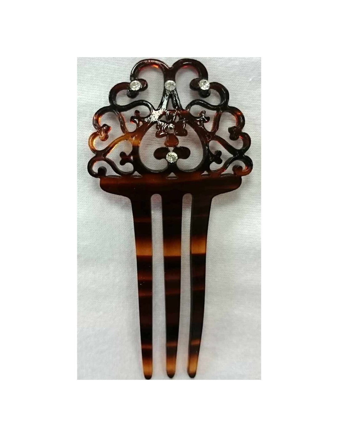 Peineta baturra de nácar en color marrón con brillantes blancos. Tiene unas medidas de 9x4cm.