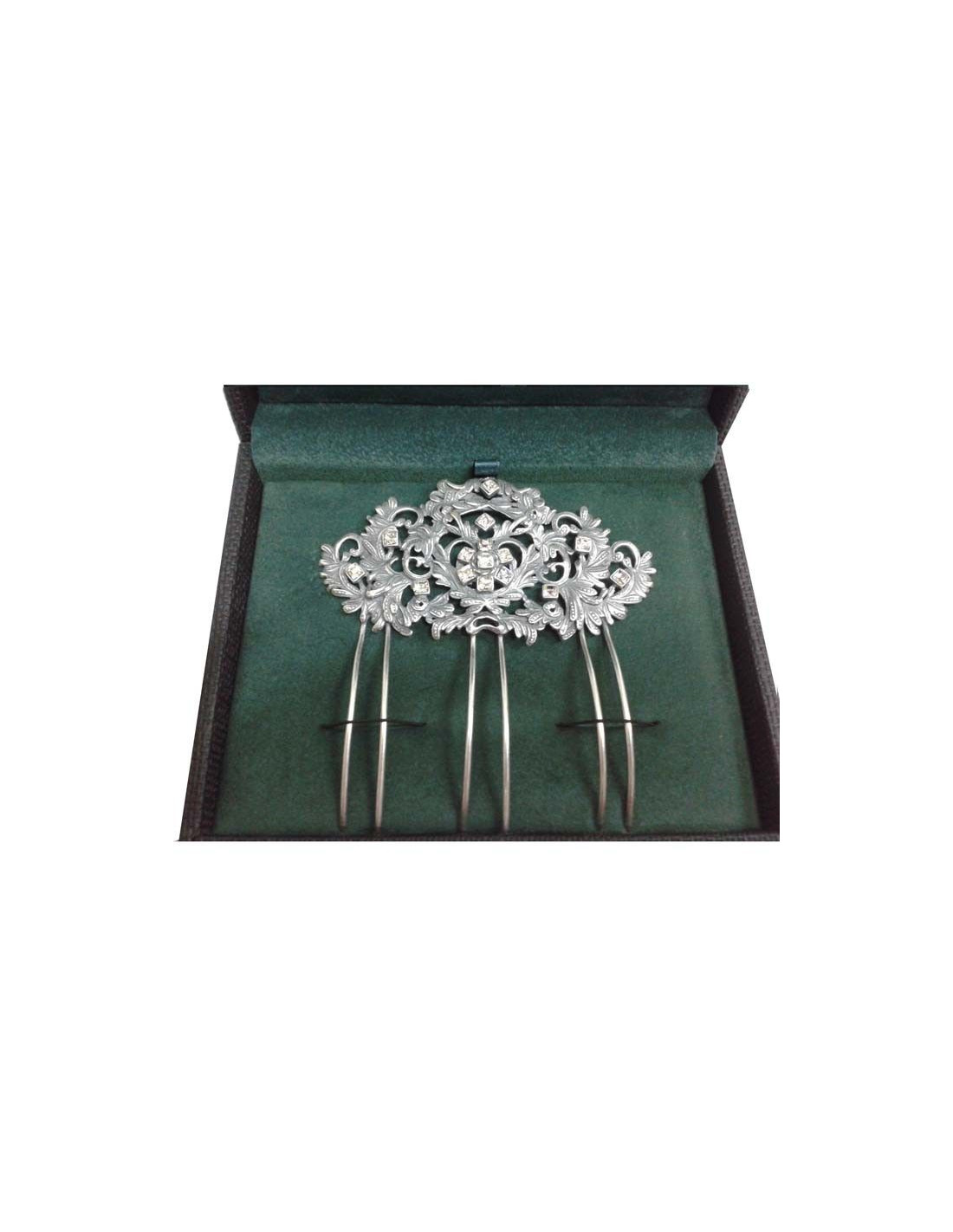 Peineta para trajes regionales de metal, bañada en plata vieja. Medidas 11x12cm. Presentacion en caja.
