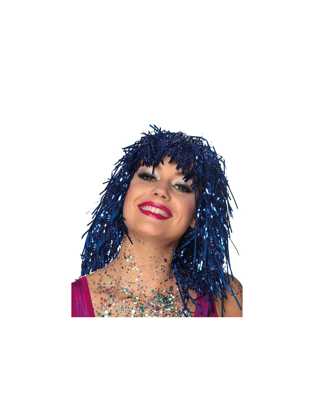 Peluca azul metalizada para adulto ideal para Cotillón o fiestas de Nochevieja.