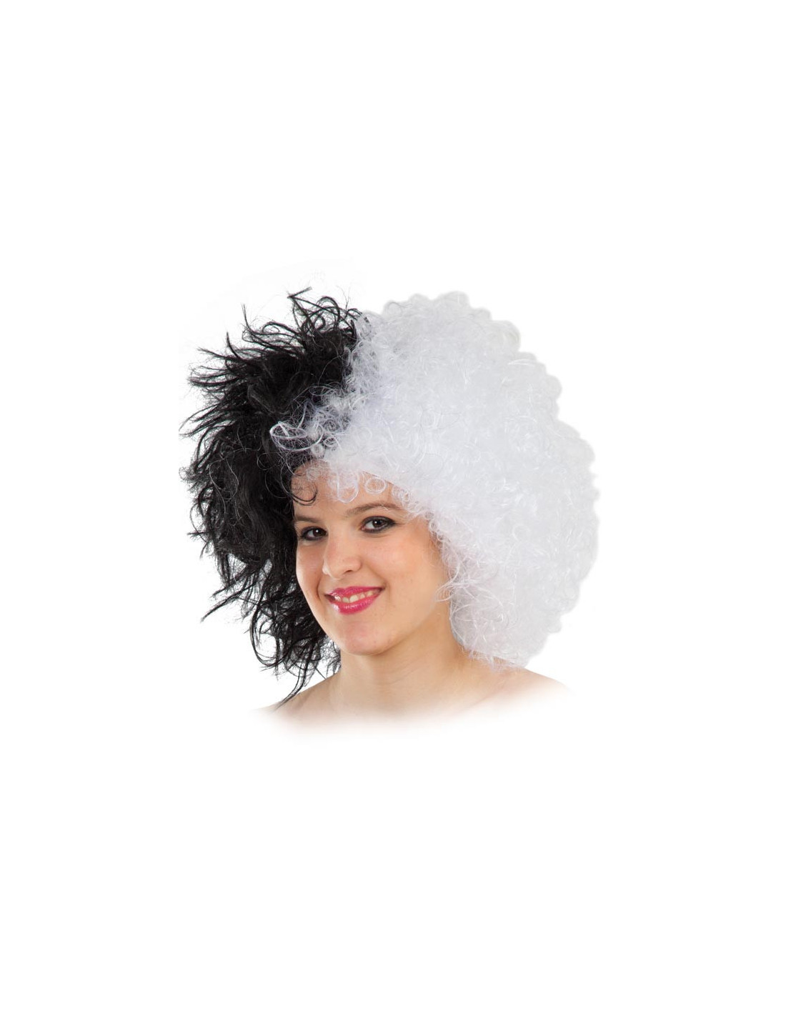 Esta peluca es bicolor en blanco y negro con pelo hueco y alocado.