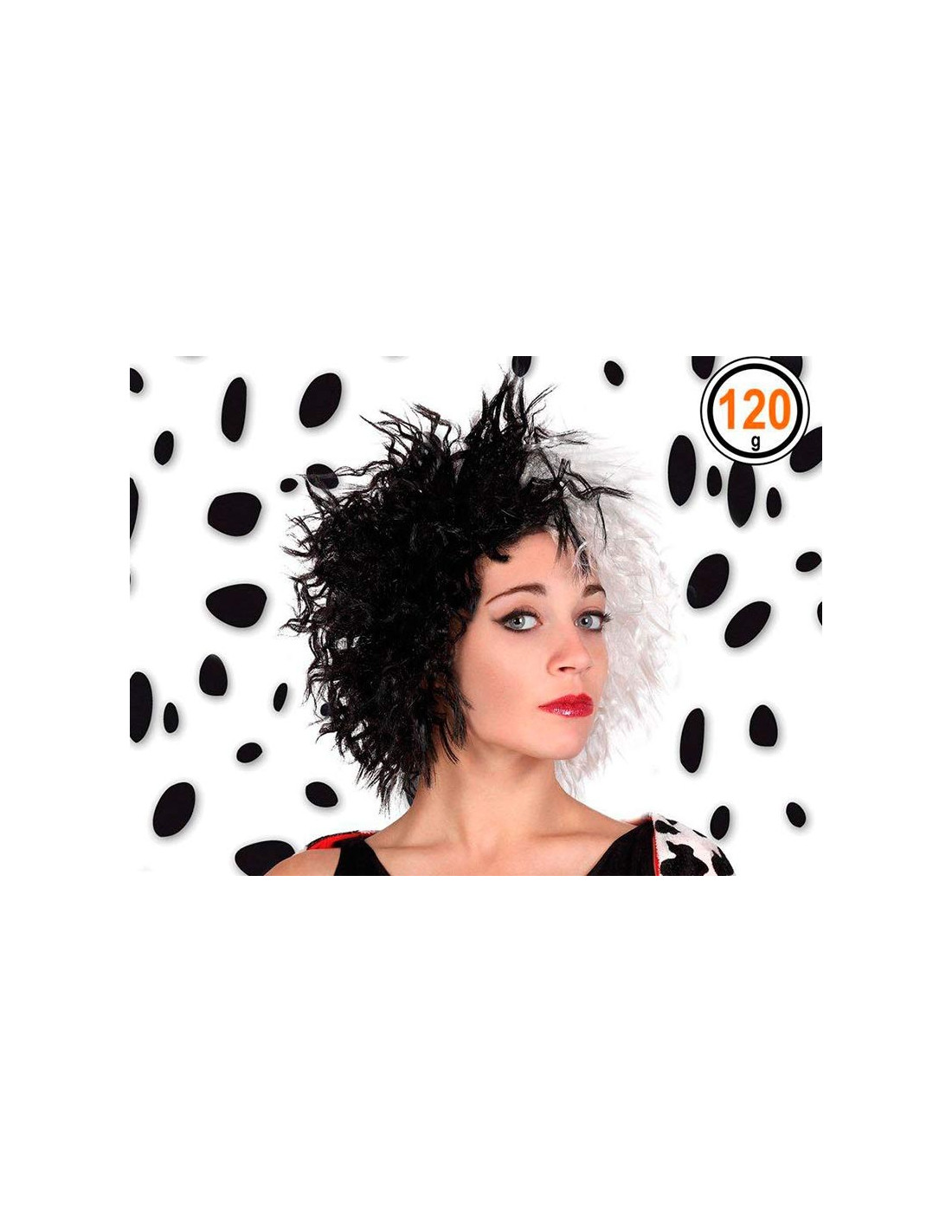 La temible villana de la película Los 101 dálmatas serás con esta peluca bicolor en blanco y negro. Ideal para completar tu disfraz de Cruella de Vil y hacerte con todos los dálmatas.