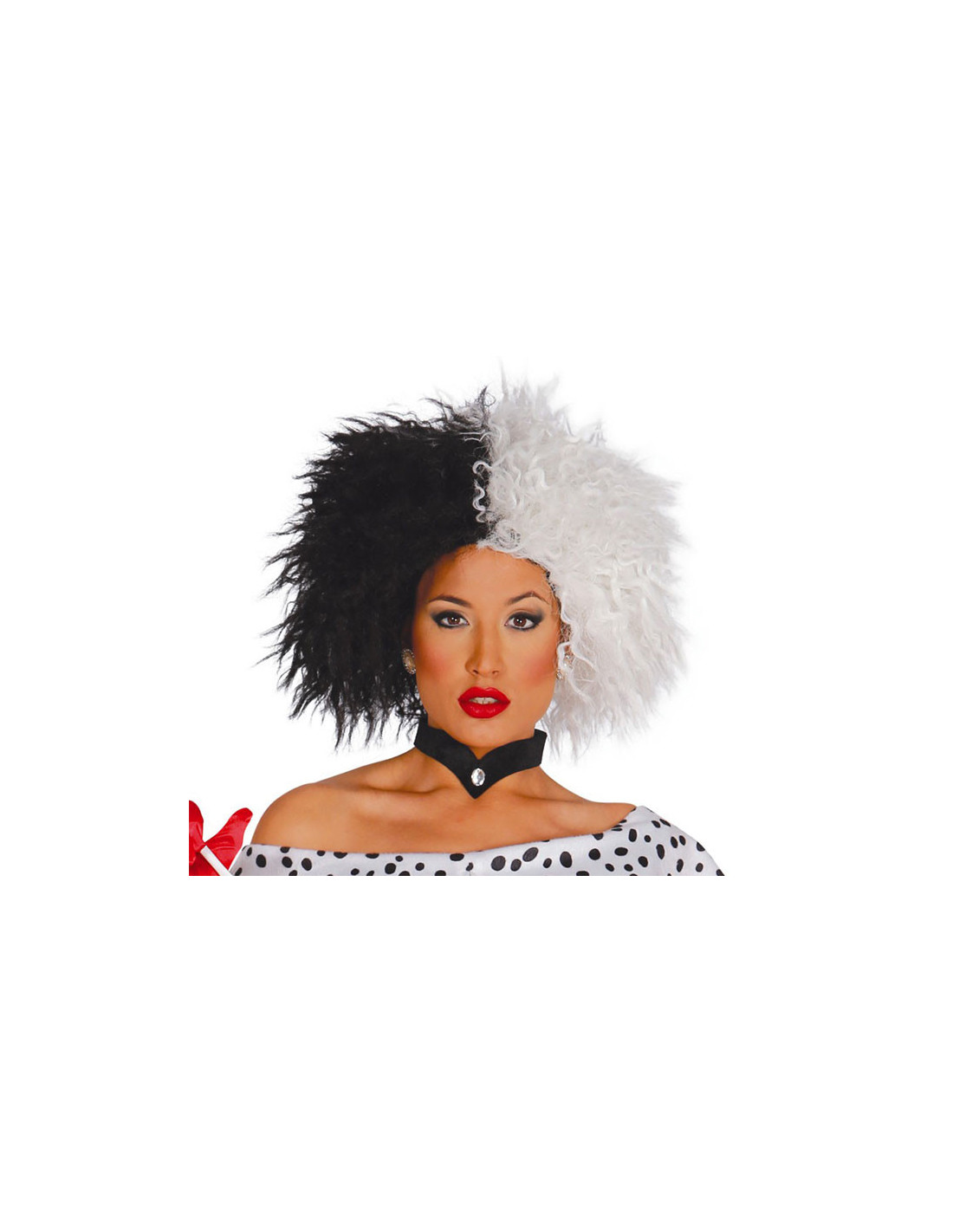 Contiene una peluca bicolor blanca y negra como la que llevaba la villana de los 101 dálmatas.