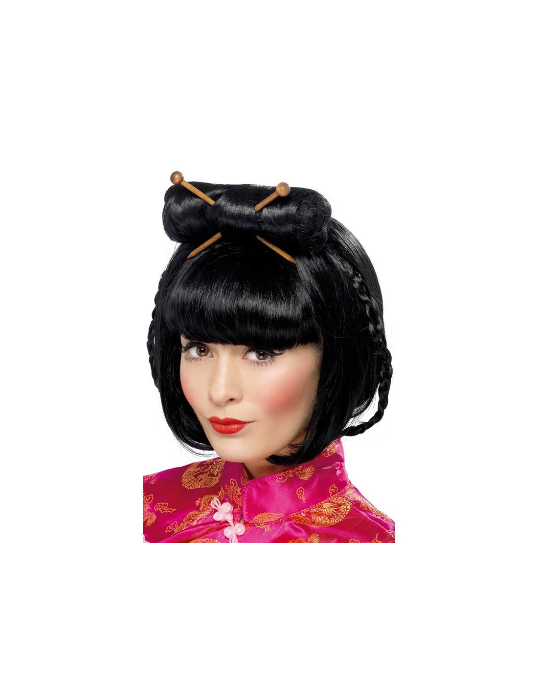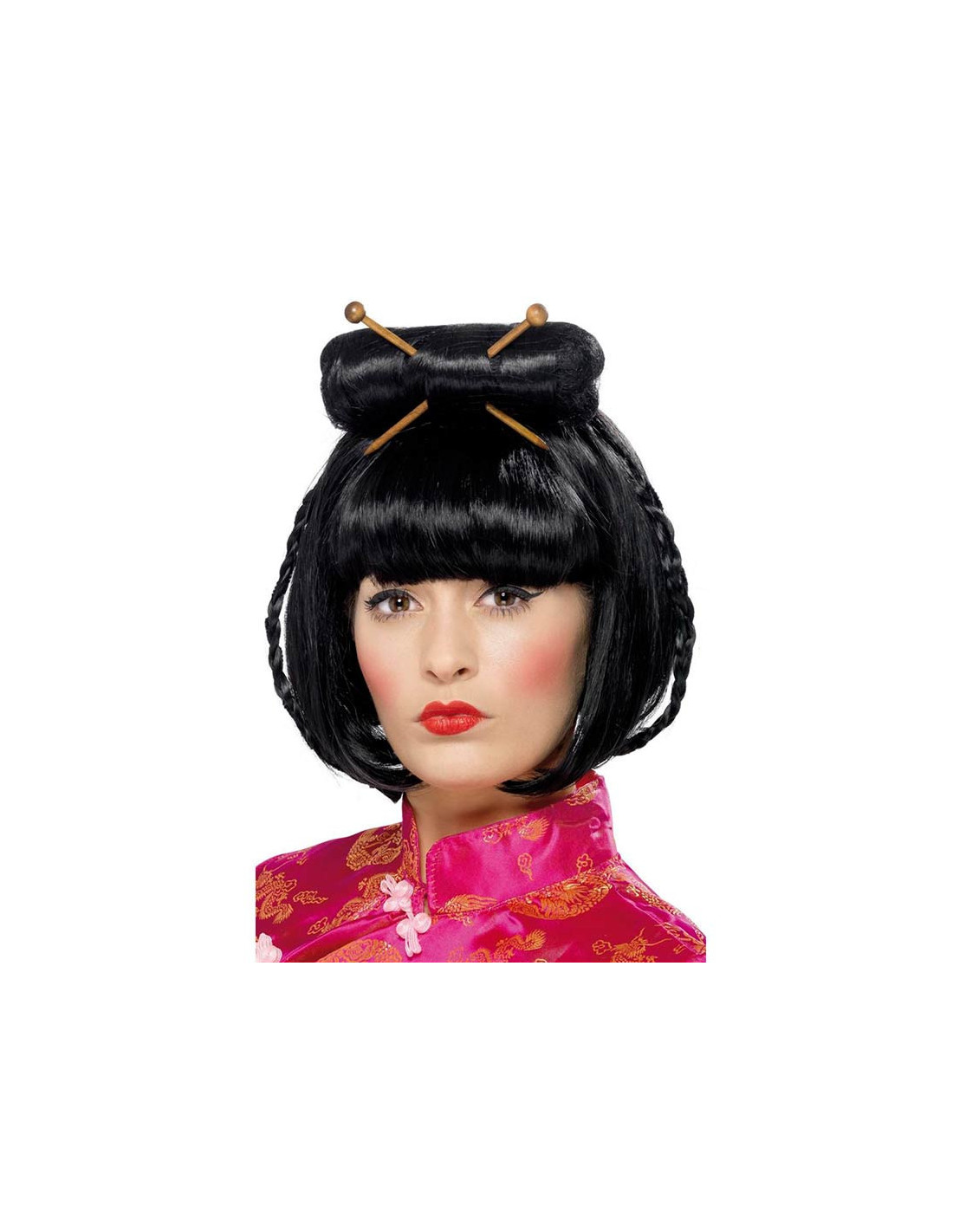 Preciosa peluca china corta para tu disfraz de geisha en Carnaval. Esta peluca corta es de color negro, tiene flequillos, una pequeña trencita en cada lateral y uno moño en la cabeza con dos agujas cruzadas.