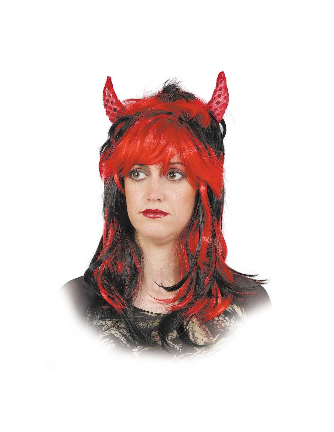 ¡Conviértete en la diabla más sexy! Con esta peluca bicolor de melena hasta los hombros podrás convertirte en el personaje maléfico que buscas o darle un toque más sexy a tu disfraz. Además, incorpora dos cuernos en color rojo que marcarán el camino hacia el averno a tus invitados.