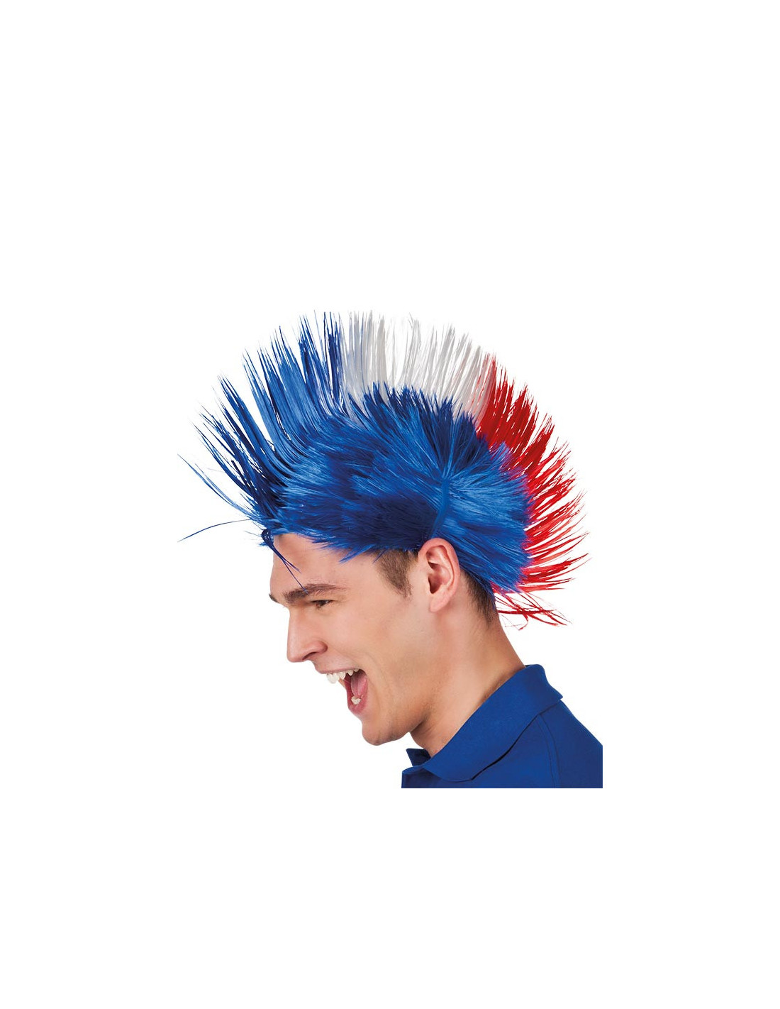 Anima a tu equipo preferido con esta Peluca Francia punk en partidos de fútbol o eventos deportivos. Esta original peluca de hincha es muy colorida, tiene una base azul y un cresta tricolor con los colores de la bandera francesa.