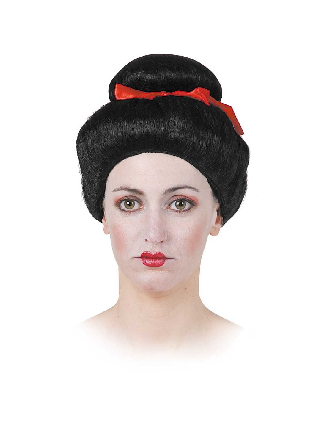 Peluca de Geisha al más puro estilo japonés que incluye con moño y cinta decorativa.