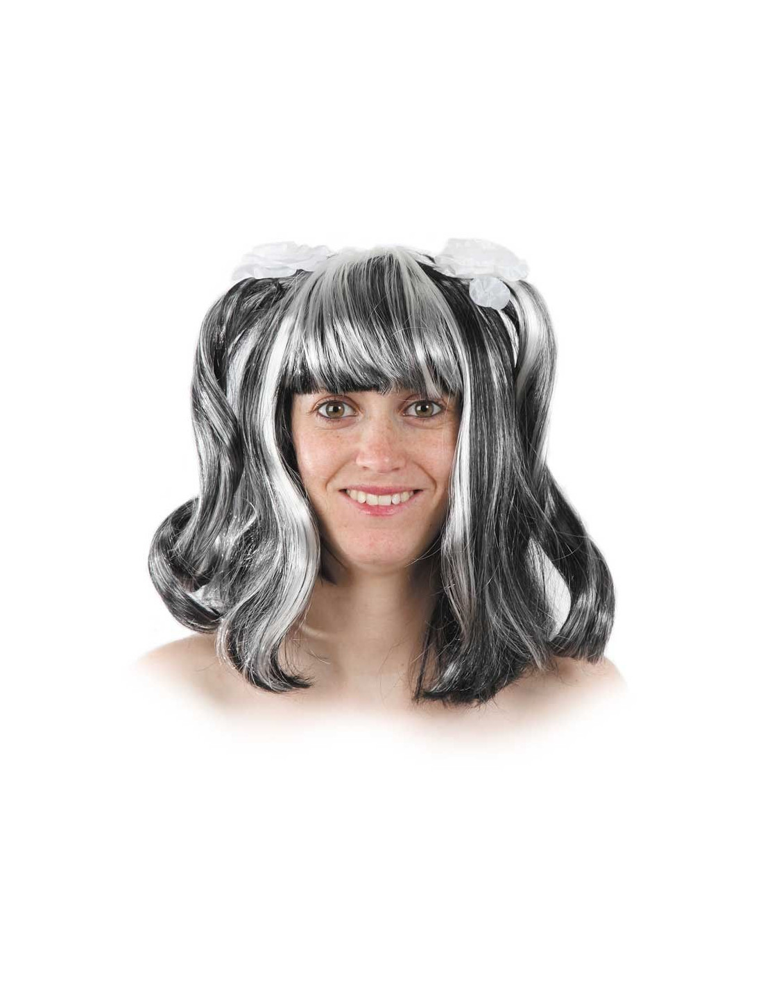 ¡Complementa tu disfraz con la peluca perfecto! Esta peluca negra con mechas blancas y dos flores en los laterales, hará que des los sustos más terribles en tu fiesta de Halloween.