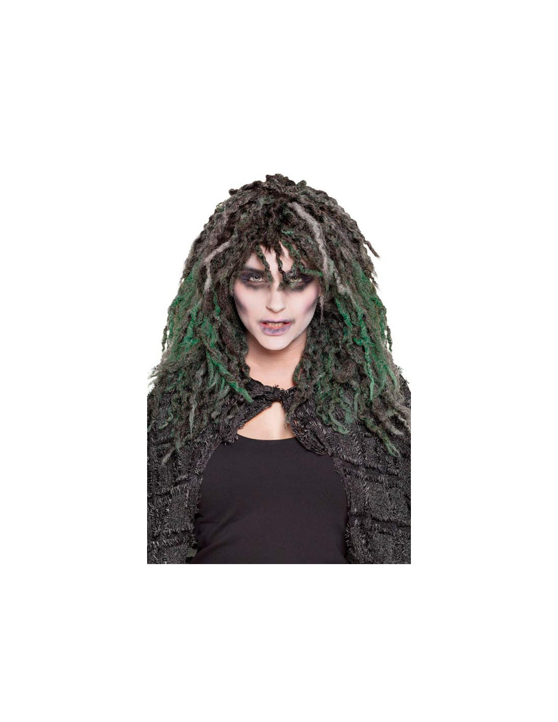 Peluca hechicera Halloween de rastas en color negro, gris y verde.