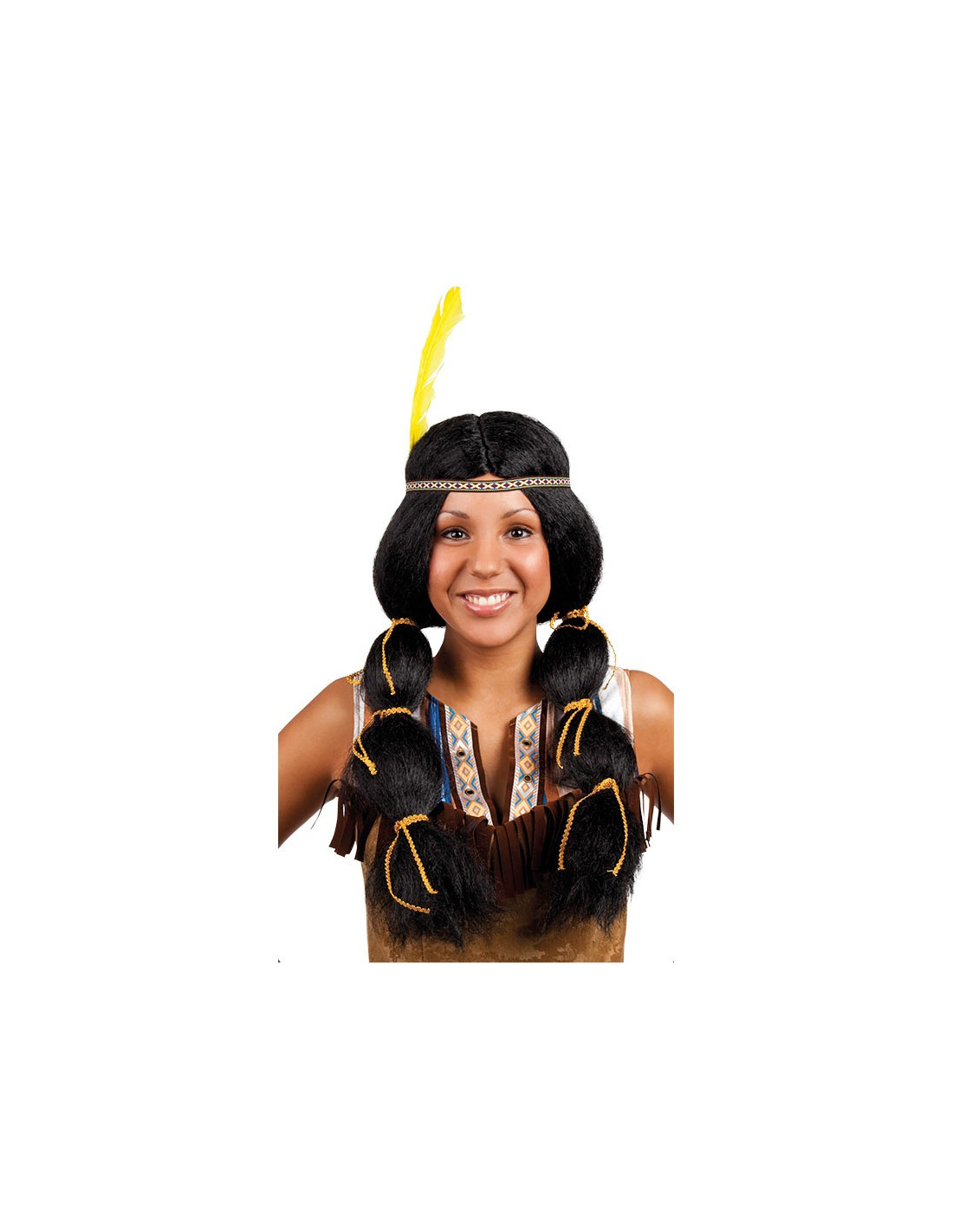 Peluca India Wynona de color negro con penacho, pluma y cintas en el pelo.