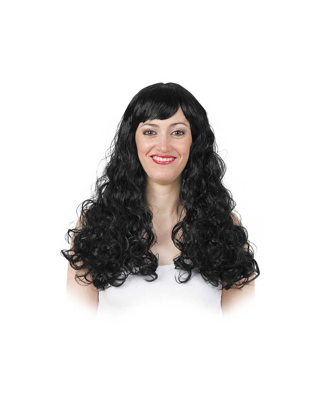 Peluca morena de melena larga ondulada hasta por debajo de los hombros y con flequillo escalado.