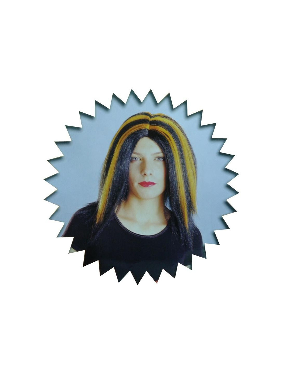 Peluca informal de media melena con mechones. Disponible tanto en color negro con mechones rosas como amarillos. ¡Elige y sorprende a tus amigas!