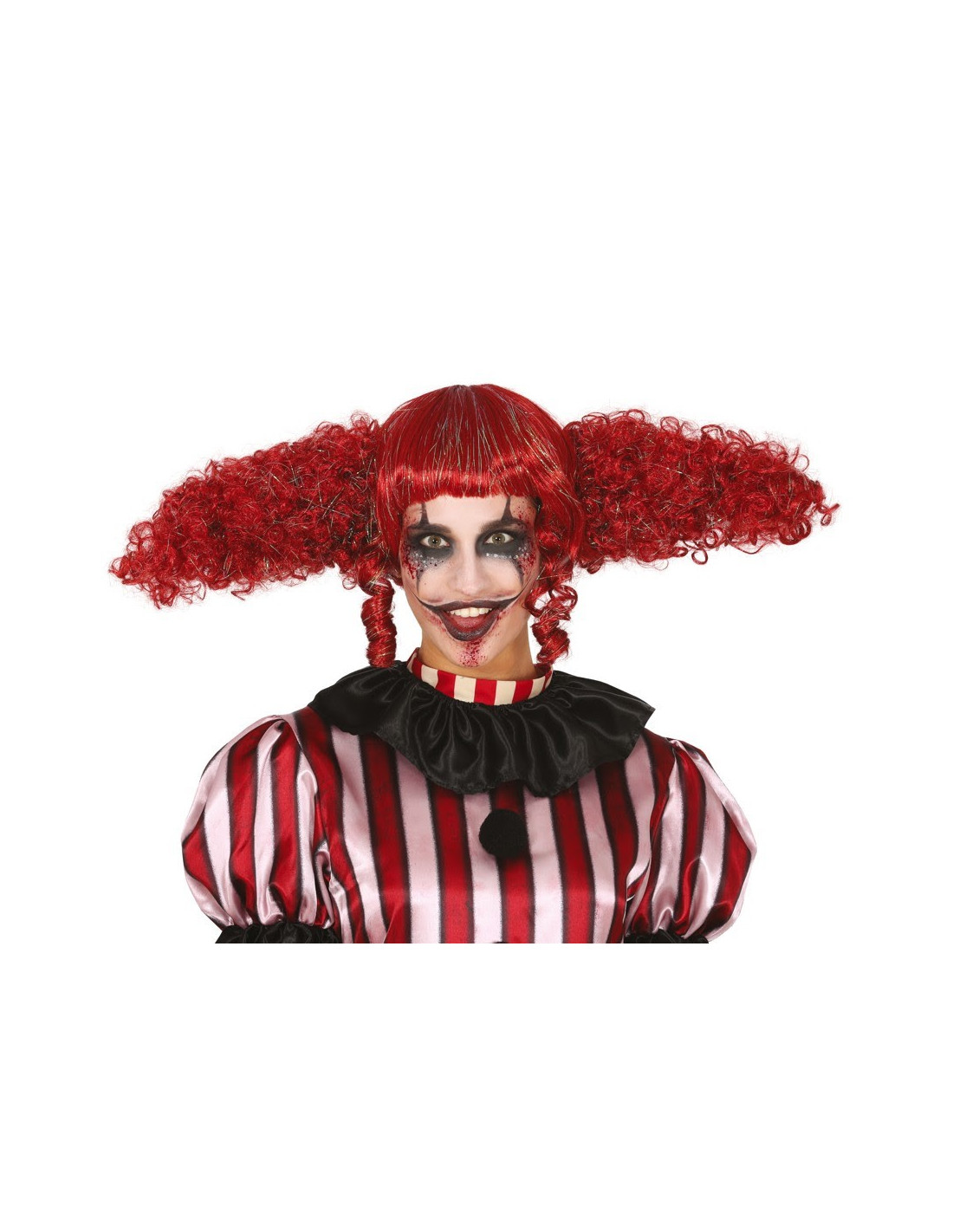 Peluca payasa alocada que incluye una peluca roja con flequillo, dos tirabuzones y dos grandes moños a los lados.