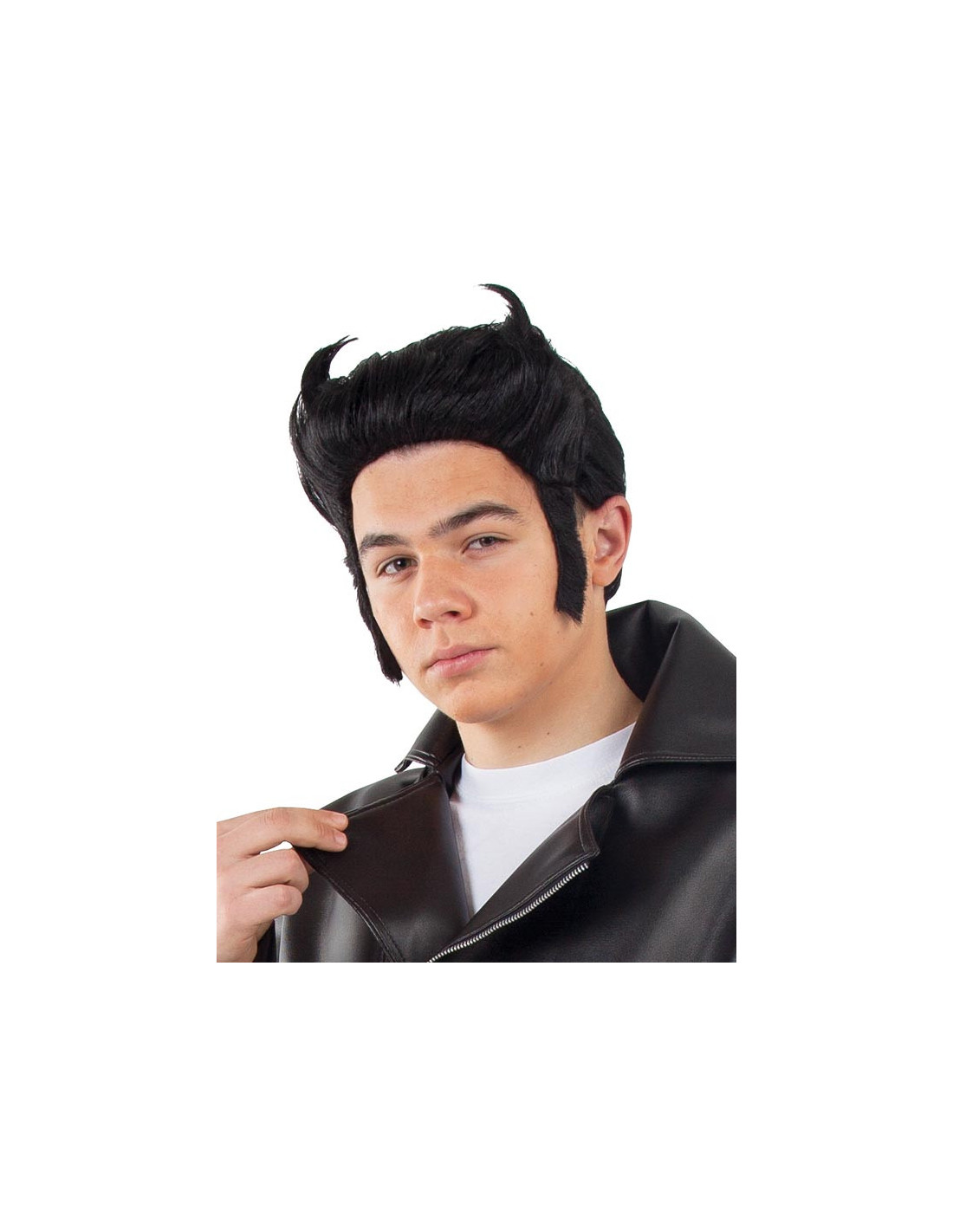 Peluca de rockabilly para hombre con la que vivirás el desenfreno de la década de los años 50. Coge tu guitarra acústica y mueve tus caderas en la pista de baile gracias a esta peluca de rockabilly para hombre, disponible en color negro, con patillas grandes clásicas del subgénero más conocido del rock, y unos cuernos imitando chorretones de gomina.