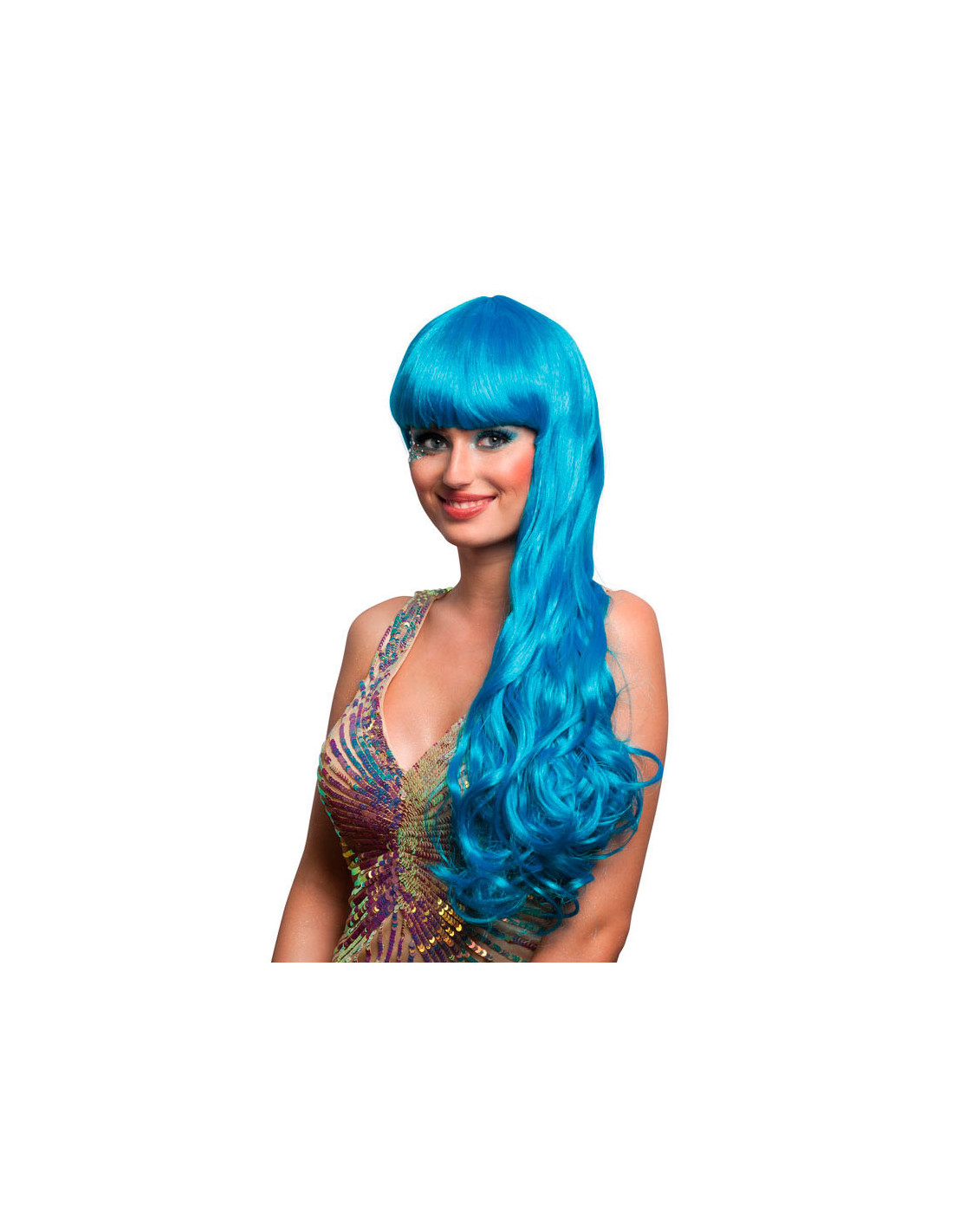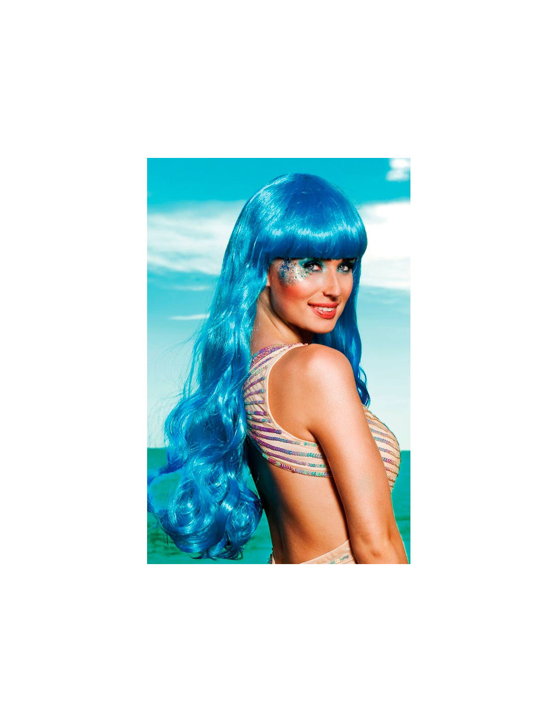 La peluca sirena es larga de pelo sintético, tiene flequillo y ondas al final de la melena.