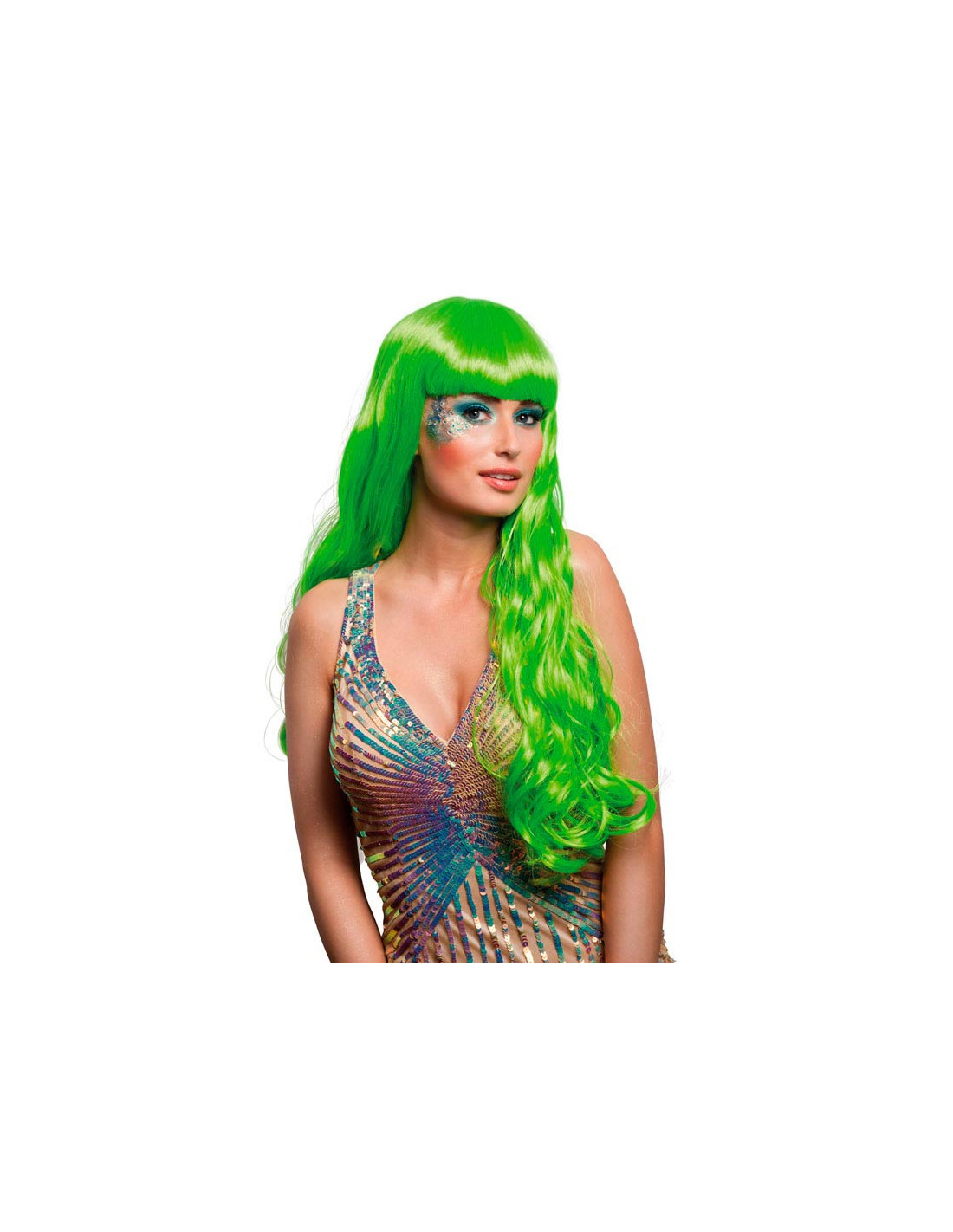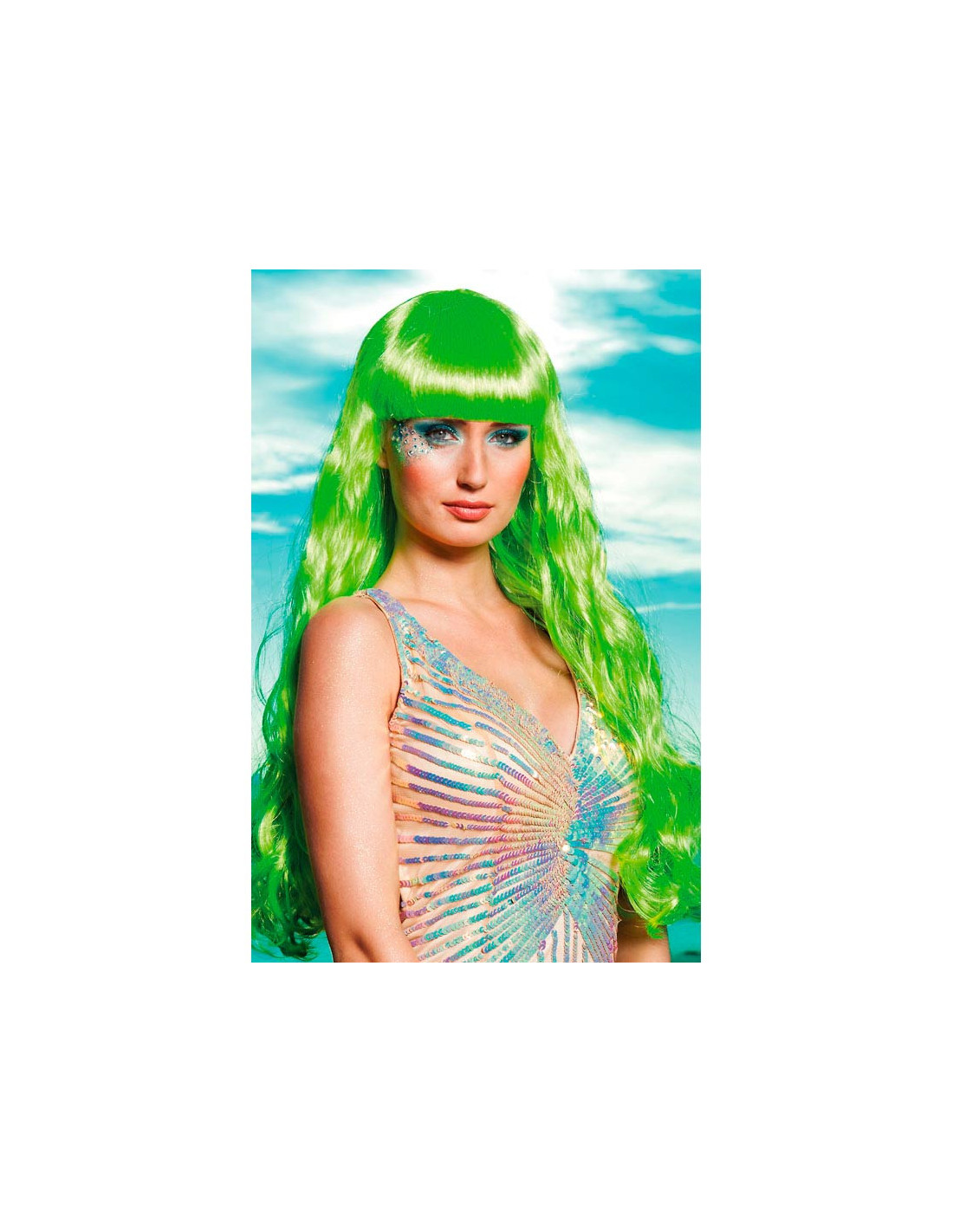 La peluca sirena es larga de pelo sintético, tiene flequillo y ondas al final de la melena.