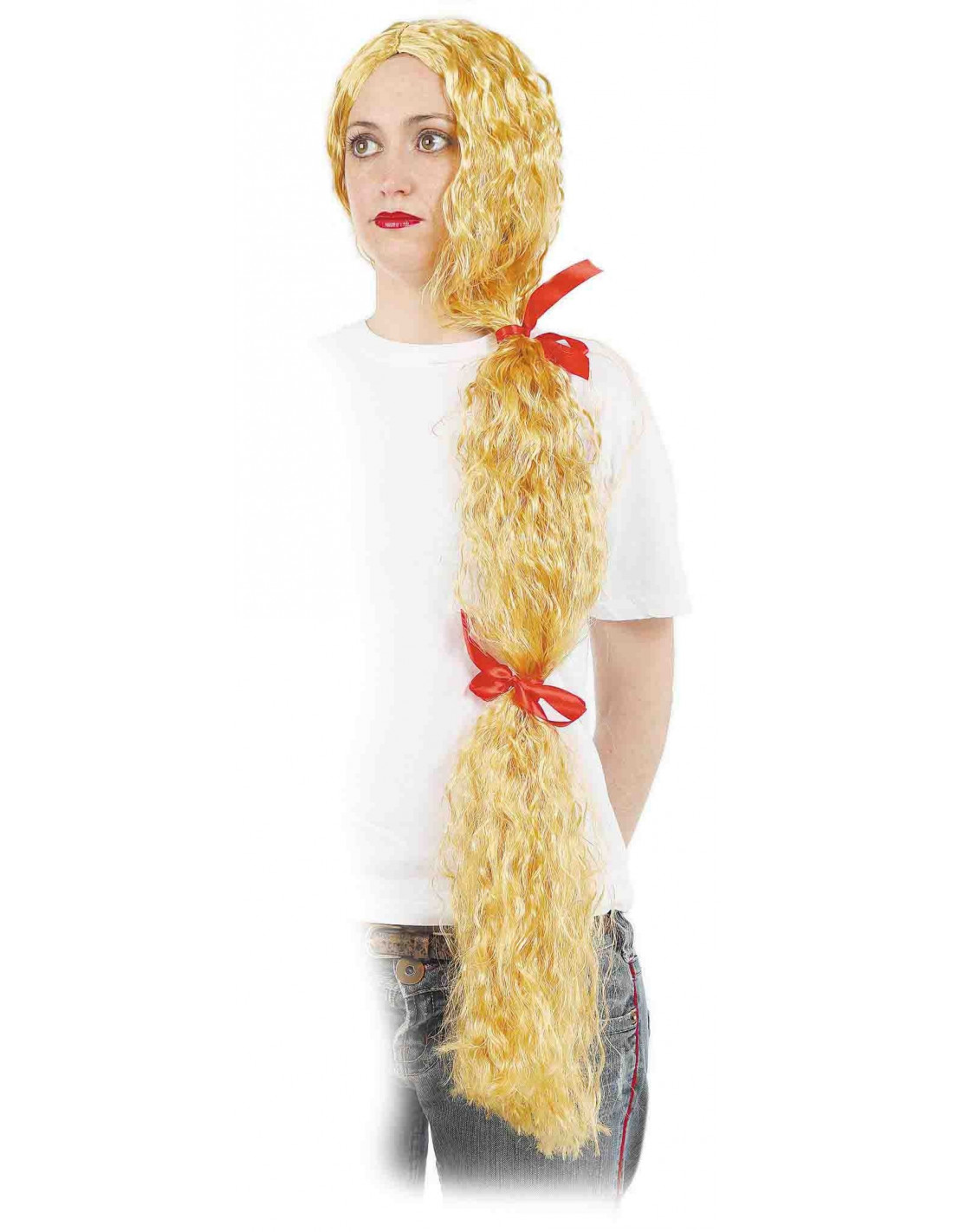 ¡Vuélvete una princesita de cuento! Con esta peluca rubia super larga de melena ondulada (recogida con dos lazos por detrás), podrás dar el toque perfecto a tu disfraz ideal.