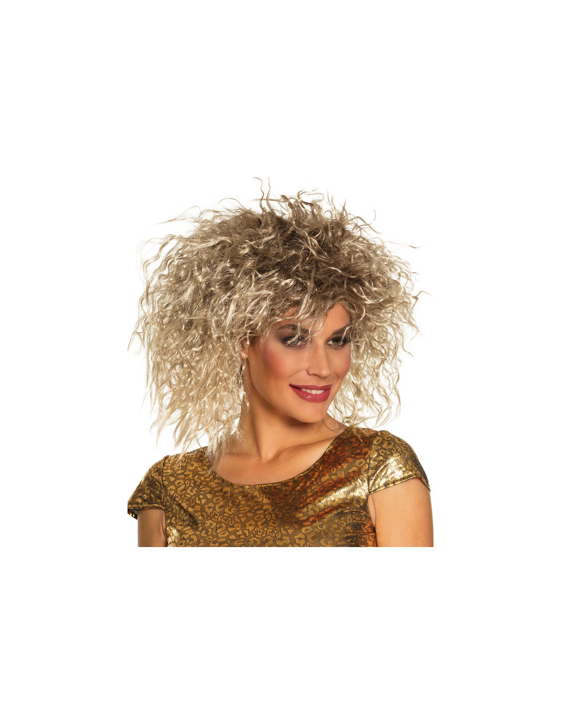 Esta peluca de Tina Turner es rubia con el pelo ondulado y alborotado.