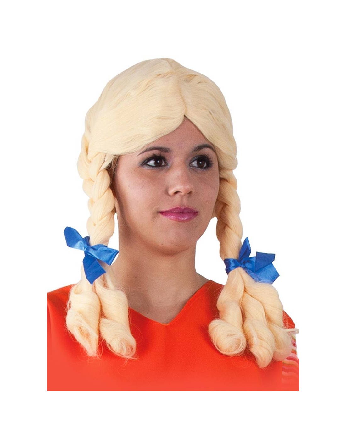 Peluca rubia con dos trenzas para completar tu disfraz de tirolesa o colegiala.