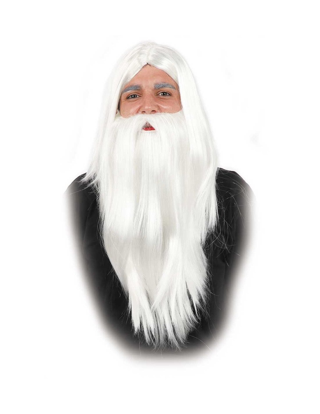 Peluca y barba blanca largas lisa, con raya en el centro y barba con bigote. Perfecta para disfraces de Rey mago, Druidas, Magos, Panoramix o Papá Noel.