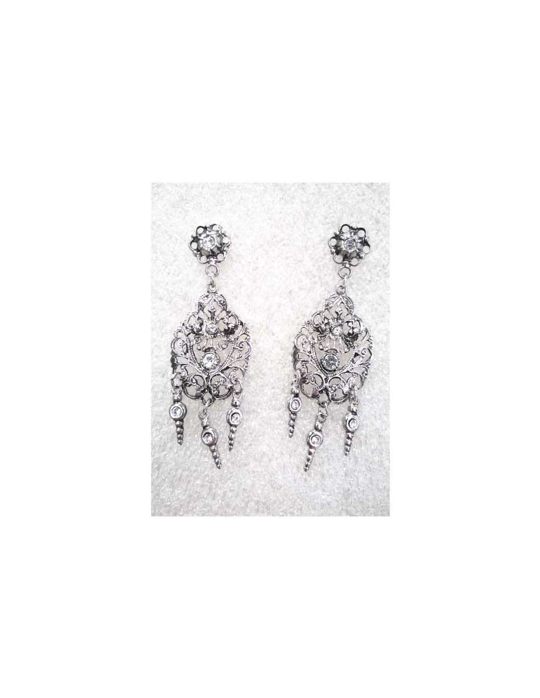Pendiente regional plata con cierre introduciendo en la oreja de 6,5cm de largo y con incrustaciones de piedras. ideal para lucir con el traje regional enfiestas folclóricas y ofrendas de flores.