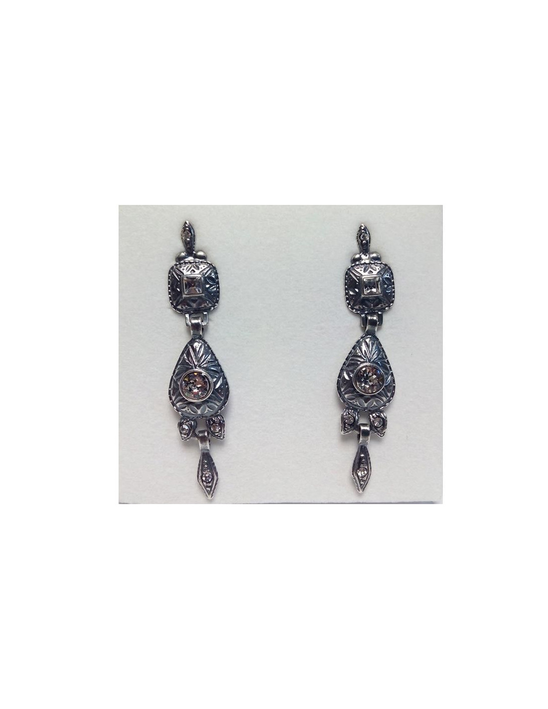 Pendientes regionales plateados con forma de lágrima y cuadrado en la parte superior, y decorados con una piedra de color. Dimensiones de 65x15 mm Se venden por parejas.