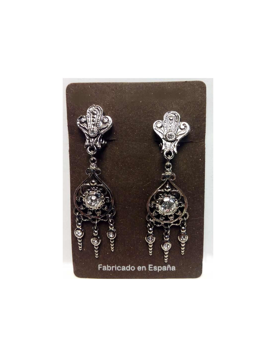 Pendientes largos para complementar tu traje regional aragonés. En color plata envejecida, decorados regionales largos plateados, decorados con una piedra de color y con unas dimensiones de 65x20 mm . Se venden en pareja. Bisutería.