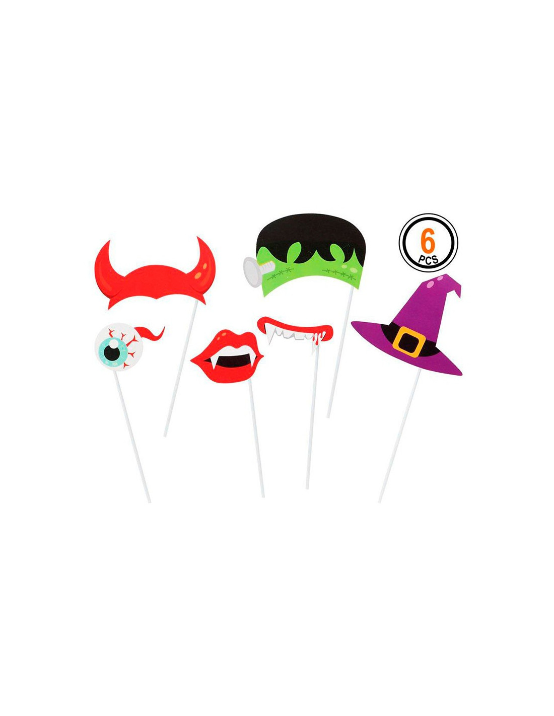 El Photocall de Halloween incluye 6 piezas compuesto por labios con dentadura, ojo, cuernos de diablo, dentadura de vampiro, sombrero de bruja y cabeza de Franky.