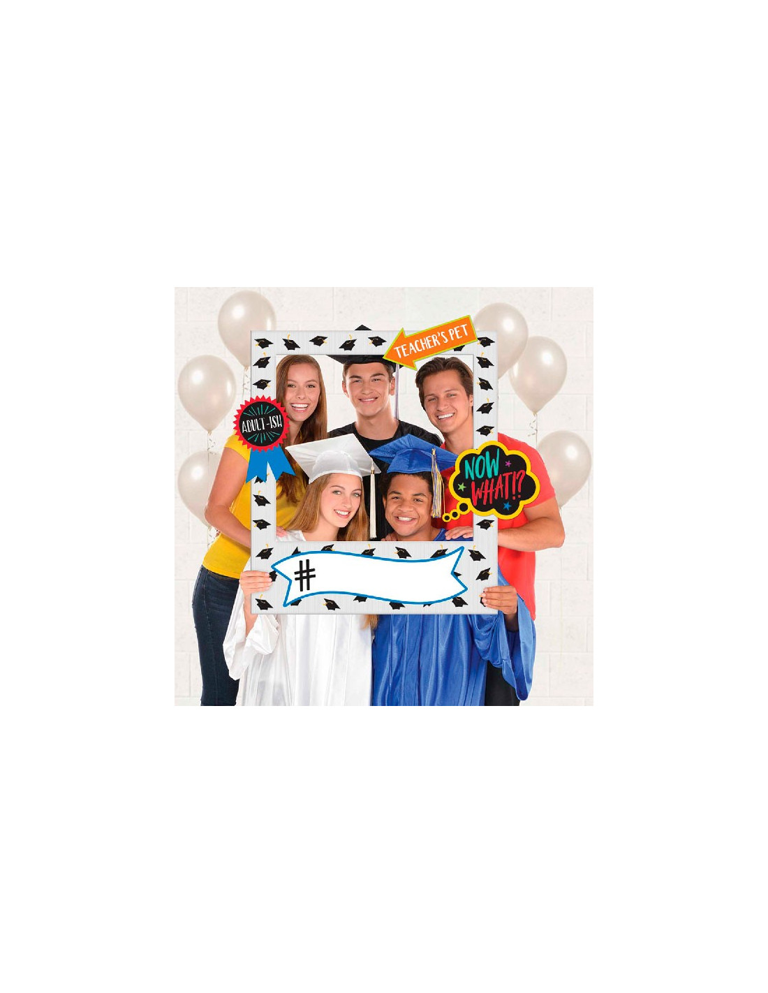 Photocall para graduación que incluye un marco de 76x89cm en cartón, además de 14 figuras recortables.