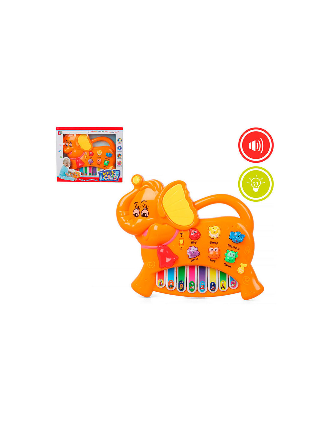 Contiene un piano con luz y sonido en forma de elefante. Tiene un tamaño de 26x21cm. Funciona con 3 pilas AA que no están incluidas.
