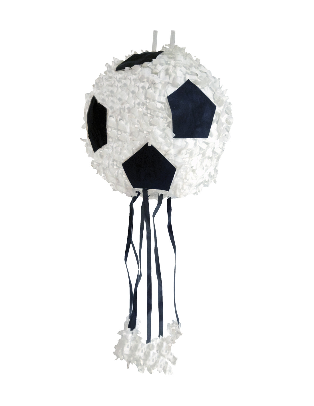 Original piñata balón de fútbol 3D para el cumpleaños de los fanáticos de ese deporte. La piñata tiene forma de pelota con un pequeño orificio tapado en la parte superior para introducir juguetes, dulces, confeti o lo que se te ocurra.