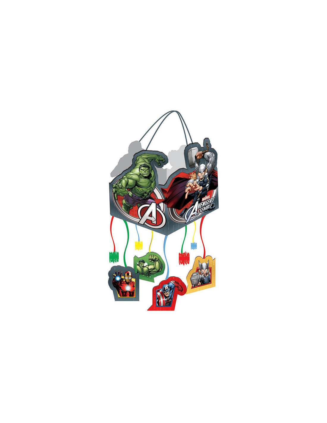 Consta de una piñata de cartón estampada con los componentes de Los Vengadores, en su interior podrás colocar dulces, confeti... (no incluido). En la parte inferior dispone de unas tiras de papel de las que tirar para que caigan los dulces.