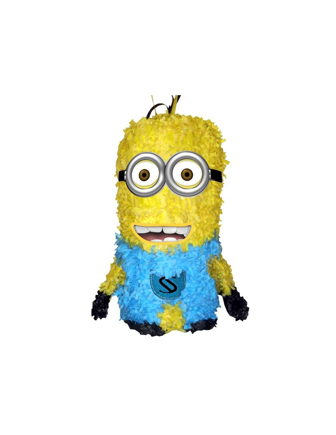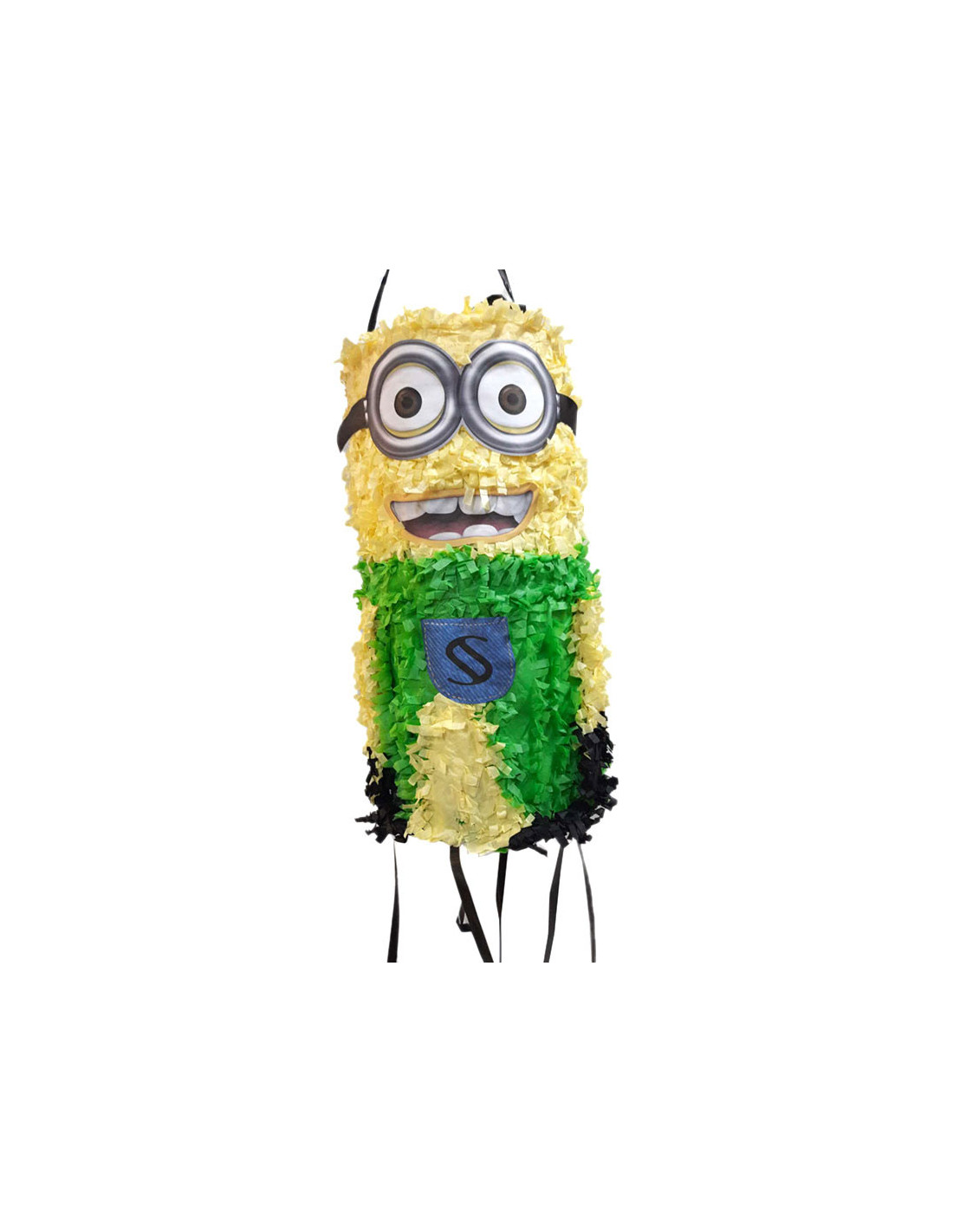 Piñata Minion en 3D confeccionada de cartón y papel de seda. Dispone de unas cintas para tirar y no romper la piñata, así podrás utilizarla de decoración. Sus medidas son de 45cm de altura x 18cm de diámetro aproximadamente. Se vende por unidad.