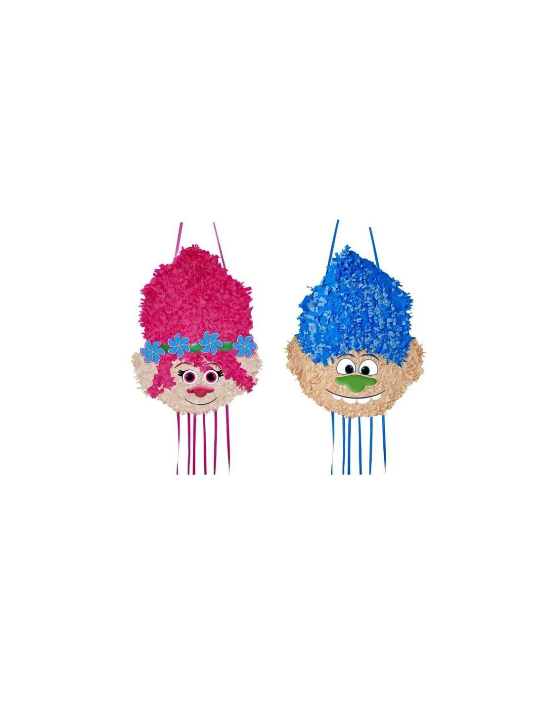 Piñata Trolls mediana para decoración de fiesta de cumpleaños infantil. Tematiza la fiesta de los más peques de la familia con sus personajes favoritos gracias a esta piñata Trolls mediana, fabricada de papel y seda, con dos modelos diferentes a elegir: del personaje Poppy y de Branch. Tiene un tamaño de 50x40cm.
